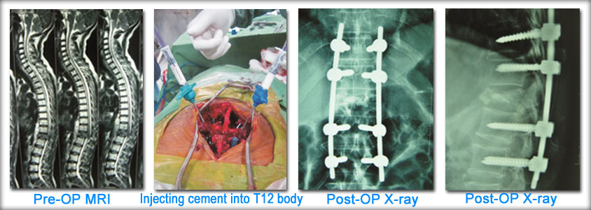 67 yr old male with multiple myeloma (malignant plasma cell tumour ) presented with T12 pathological collapse and serve pain. Stabilisation , decompression and vertebroplasty was done to relieve the pain.