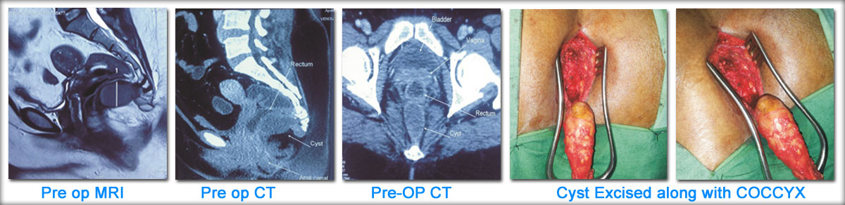 54 yr old women with pain in tail bone on sitting was found to have cystic tumour attached to coccyx. Coccygectomy with tumour excision was done and patient got relieved of symptoms.