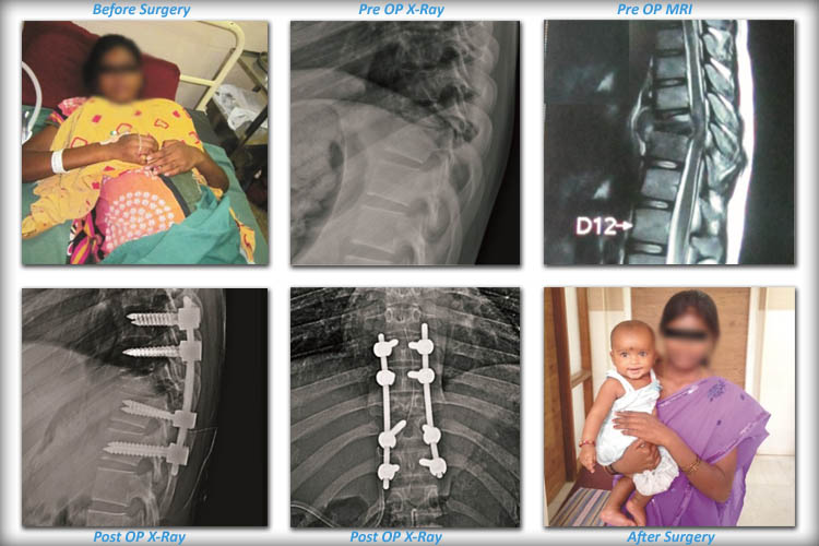 20yr old woman with 8 months pregnancy got admitted with mid back pain and paraplegia. MRI showed Tuberculosis infection of T9 vertebra with collapse and cord compression. Emergency caesarion section was done for delivering the baby followed by spine surgery for stabilization and decompression of the spinal cord. Patient recovered completely at 4 months follow up and baby was also healthy after initial NICU care